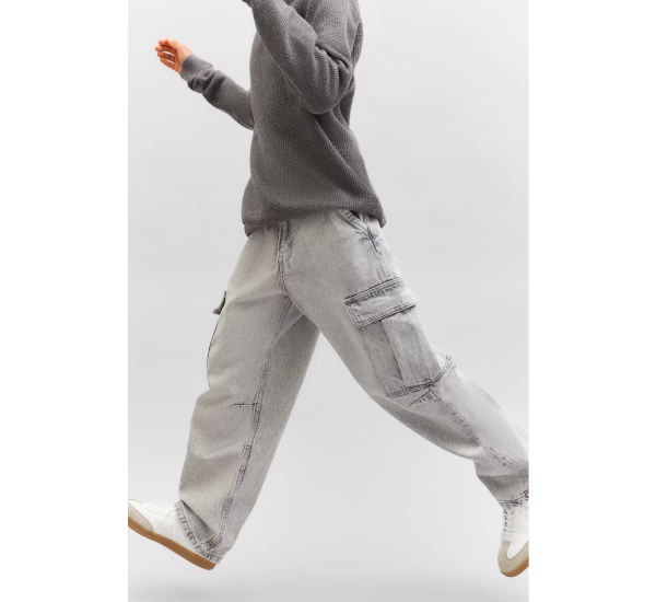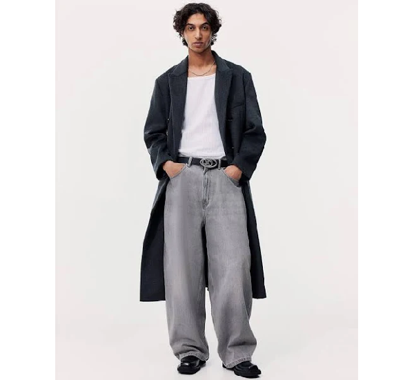 Men’s Baggy Light Grey Jeans: Baggy fit from seat to hem in rigid cotton denim with a light grey wash. Features a regular waist, dropped crotch, and rounded leg that may stack at the ankle. A comfortable and casual style in a versatile neutral color.