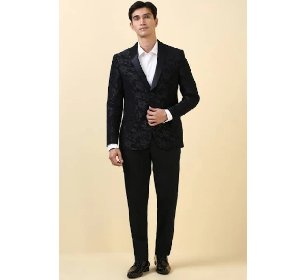 - Matching Flat-Front Trousers: Designed with a modern aesthetic, these trousers typically feature a mid-rise, belt loops, and a sleek, straight or subtly tapered leg that perfectly complements the jacket’s slim fit. They are designed to sit smoothly without pleats, contributing to the suit’s clean and contemporary lines.